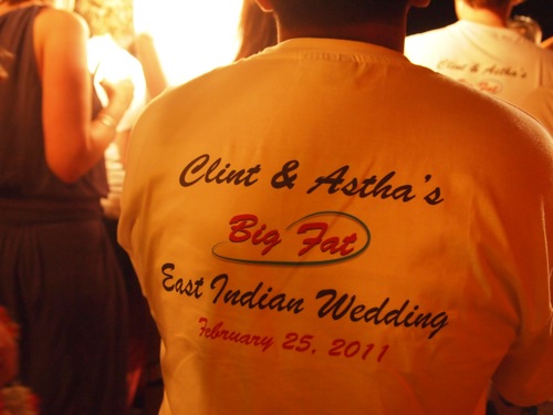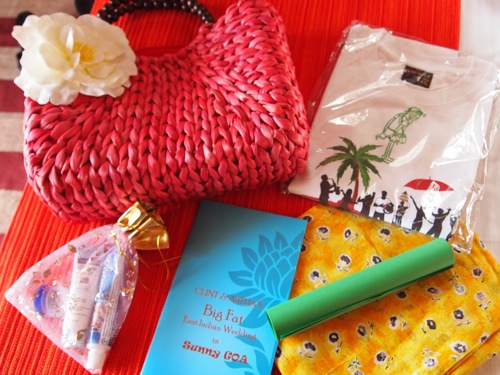 さて、こちらは結婚式グッズ。本日のファンクションは「カジュアルに」が強調されている。男性はこのオリジナルTシャツにルンギ(腰巻き)を、女性は赤いバッグを持参くださいとのこと。