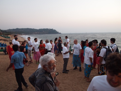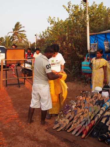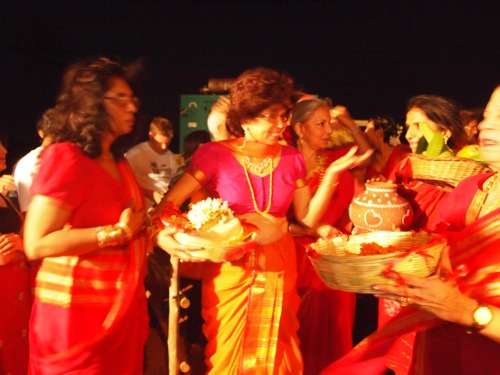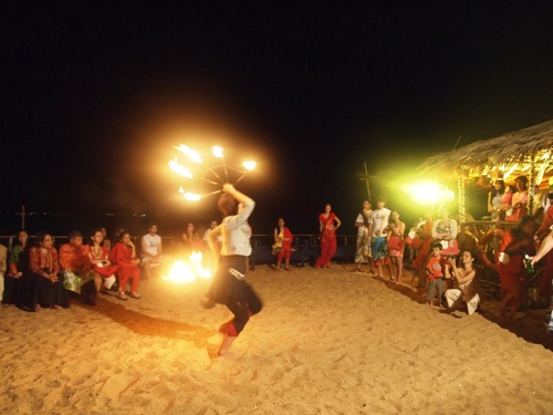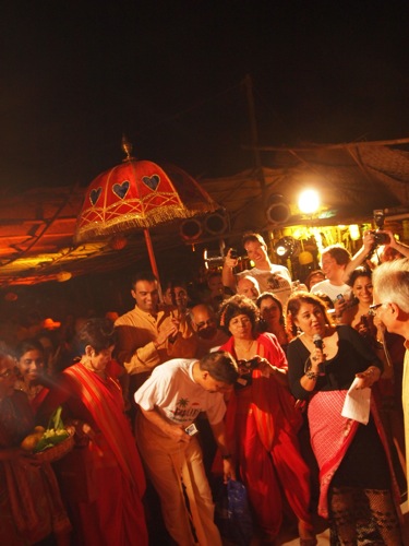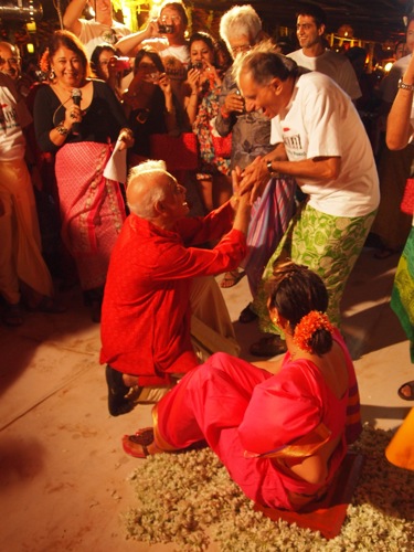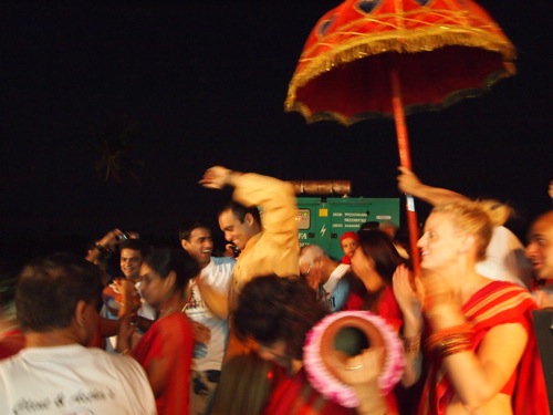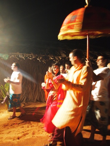 井戸水を汲み終えて、二人して「海の家」のステージに戻り行く様子。ヒンドゥー式を含めれば、これですでに3度目の儀式である。明日の教会を含めて4回。見ている方も「なにがなんだか」という価値観の混在だ。