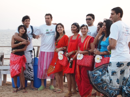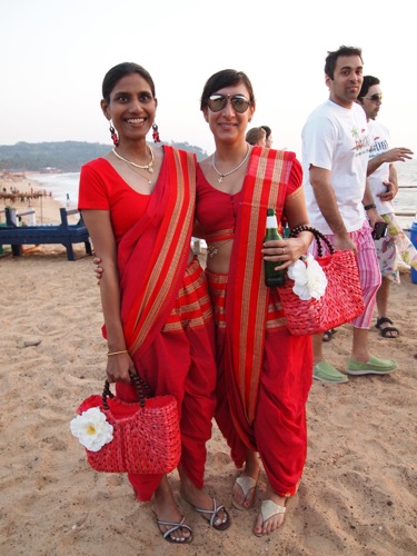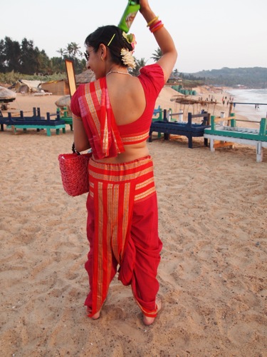 下の写真は、ゴア風のサリーを着ているガールズ。着やすいよう、ひだなどがあらかじめ縫い付けられているようだ。パンツルックのような独特のシェイプである。