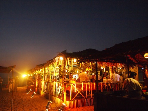 「海の家」も夜になりライトアップされることには「いい感じ」のムードだ。さて、すっかり日が暮れてようやく、楽団到着。またしてもリズミカルな音楽が打ち鳴らされて、みな、海の家の入り口へ。