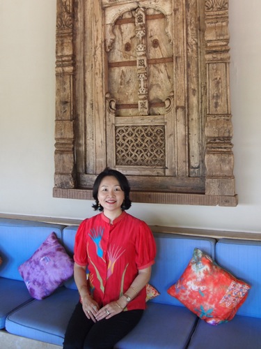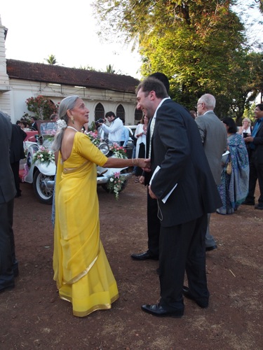 夕べのゴア風サリー姿とは打って変わり、エレガントなウェンディ。ドレスの後ろ姿、裾のドレープがすてきだ。