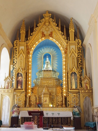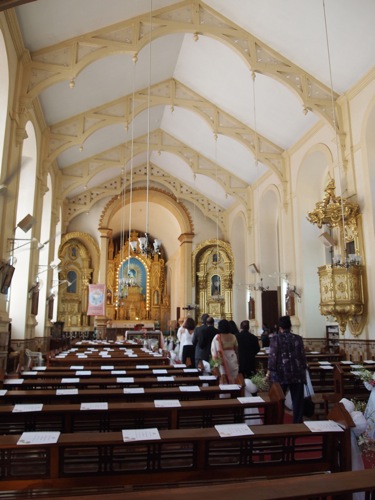 教会は至るところ、麗しい花々で彩られ、なんとも美しい。中に入れば、ゴアの職人の手による黄金色の祭壇がまばゆく、ブルーとのコントラストが鮮やかだ。