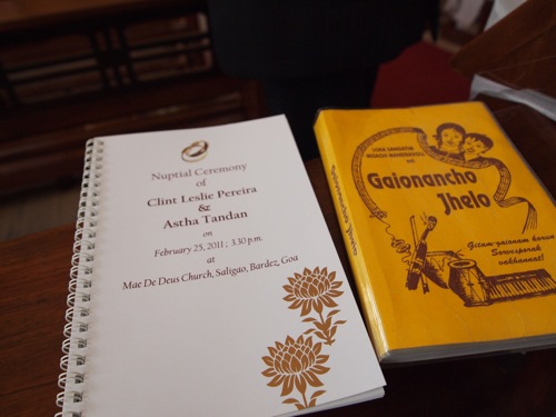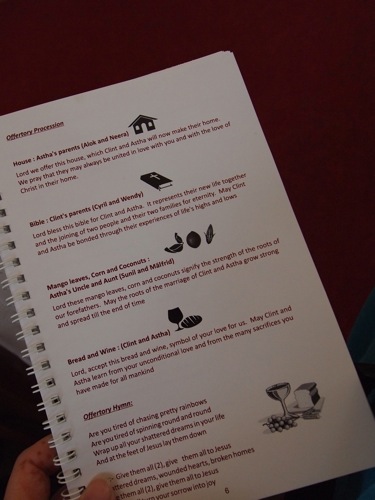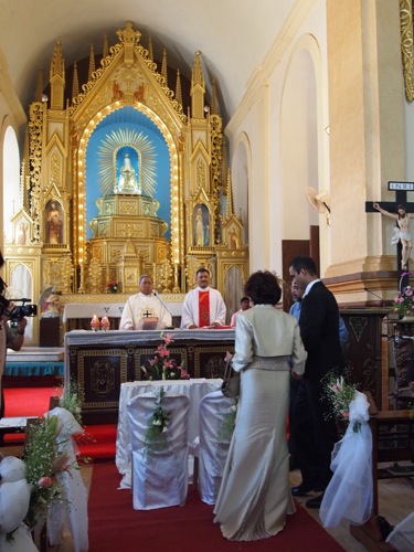 さて、神父たちが登壇し、いよいよ挙式が始まる。神聖なる式の最中には、写真撮影を控え、式に集中である。立ったり座ったり、話を聞いたり歌ったり、を何度も繰り返す。