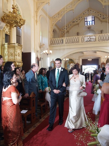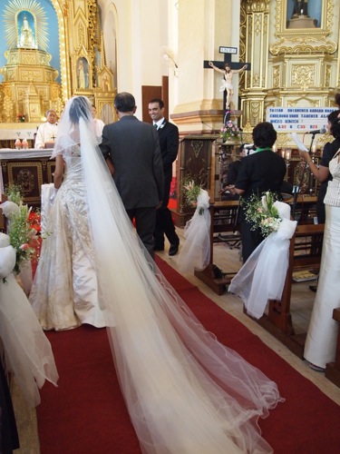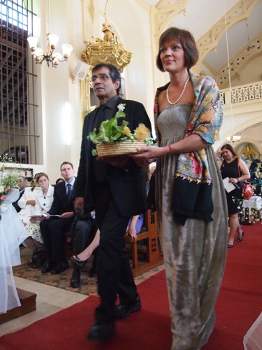 まずは新婦の両親が、家を模したものを両手に捧げて祭壇へ向かう。次に新郎の両親が聖書を、そして新婦の叔父夫婦(ニラの兄とノルウェー人の妻)が、マンゴーの葉、ココナツの実、トウモロコシの入ったかごを祭壇へ。