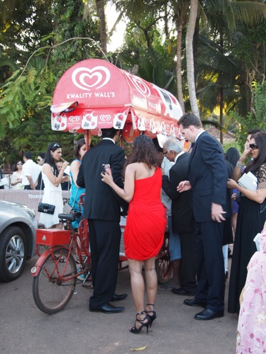新郎新婦を見送って、さて、我々も披露宴の場所へ移動すべく、駐車場へ……。と、駐車場の一画の、アイスクリーム屋台の前に群がる人々。