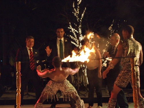 さて、バンドが休憩の間、またしても! ファイヤ〜!! な出し物だ。やったら鍛えられた男子3人が床運動的アトラクションを見せた後、火の大道芸を披露。