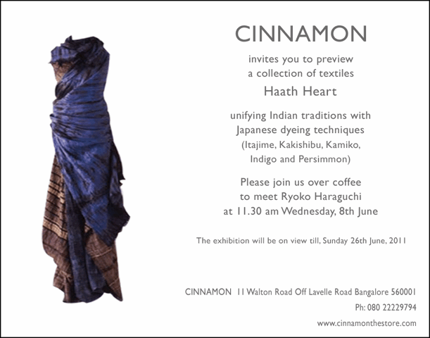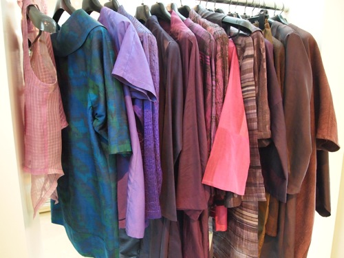 20数年前より、インドへ足を運び、さまざまな布に触れ合っていらっしゃったとのこと。インドの伝統的な手紡ぎや手織りのシルクの生地に、日本の柿渋、板締めなどで染めを重ね、色を創造されている。