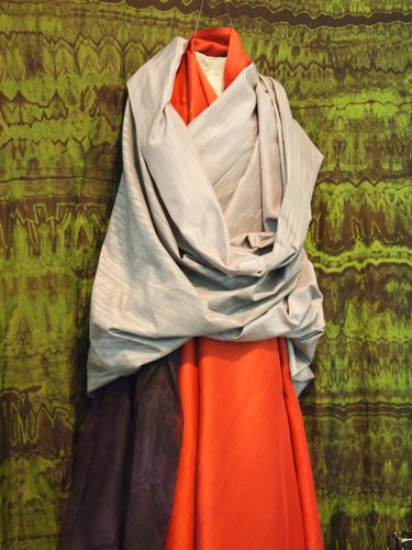 布の織りの厚みと、色の深さが生かされた、立体的なデザイン。大胆なカットがまた、身体のラインをきれいに見せている。