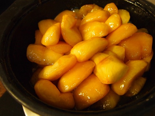 左上の写真。一見、「大学芋?」だが、これはリンゴを煮ている様子だ。このリンゴ、ロイヤル・ガラアップルもニュージーランドから。