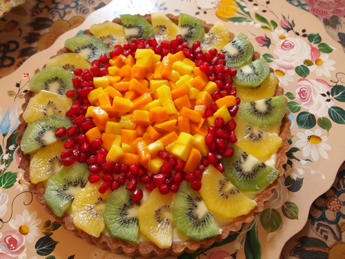 タルト中央の黄色いフルーツは、マンゴーである。マンゴーの女王、アルフォンソのシーズンは終わったが、まだ他のさまざまな種類のマンゴーが出回っているのだ。少なくとも今月一杯は、マンゴーの季節が続く模様。