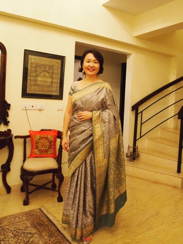 さて、サリー着付け教室をやるだけあり、もちろんサリー着用だ。これは、以前工芸品フェアで、職人から直接購入したヴェナレスのバラナシ・シルク。