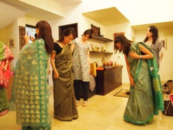 2人1組になって、互いにサポートしつつ、交替で着用する。わたしは、自分がサリーを脱ぎ着しながら、サリーの着用法のポイントなどを説明する。