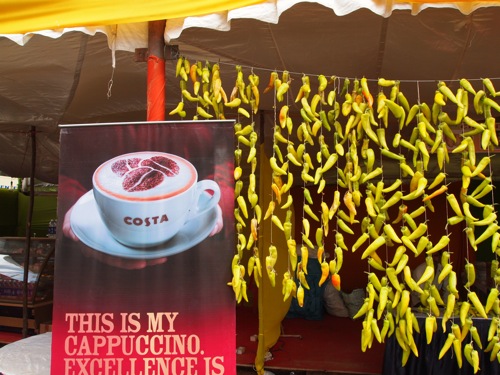 休憩所には、COSTA COFFEEの出店も。その隣では、チリ(グリーンペッパー)の暖簾が。チリの天ぷらをスナックとして出していた。