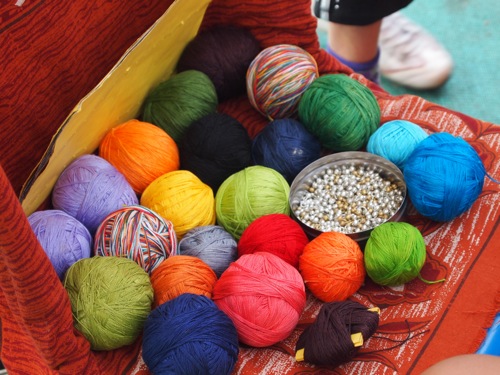 ジュエリー作りのデモンストレーションにて。さまざまな石のビーズと、カラフルな糸を組み合わせて、カジュアルなネックレスなどを作ってくれる。