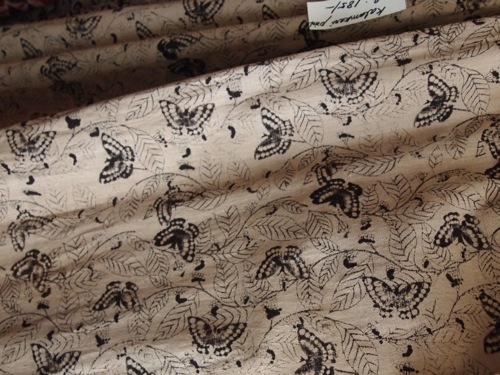 彼女は3つのブランドを持っており、3種類の店を出していた。上のブロックプリントの木綿布は、蝶の柄がすてきで購入した。1メートルあたり185ルピー。350円ほど。