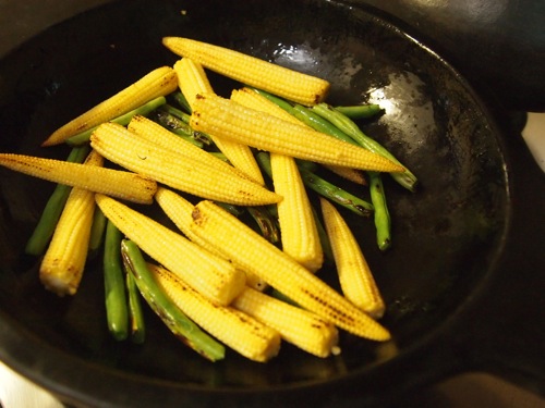 それから毎度おなじみニンジンスープ。今日はカレー風味のスパイスを加えた。右はベビーコーンとインゲンを塩こしょうでソテー。石鍋で焼くと、炭火で焼いたような風味になるのが、うれしい。