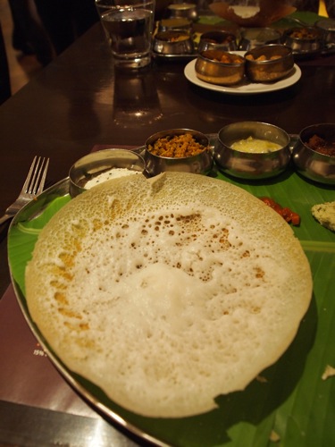 左上は、南インドの主食の一つ。米の粉と豆の粉で作られた「アッパム」。