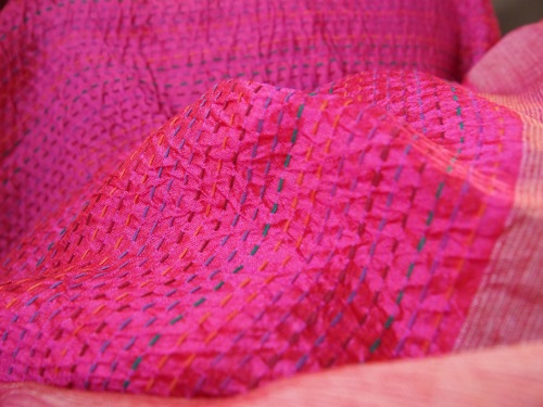 このサリーは、ベンガル地方のカンタ刺繍が施されたもの。