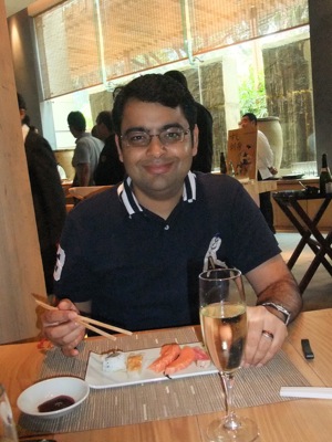 さて、スパークリングワインで乾杯のあと、まずはお刺身。わたしたちのお気に入りはサーモンやイカ。それにソフトシェルクラブの巻き寿司など。