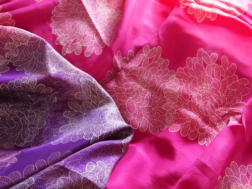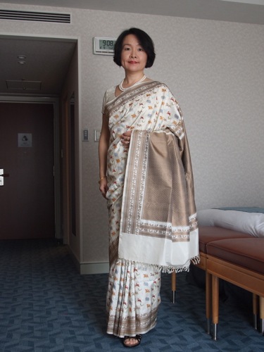 わたしの着ているサリーは、モダン系の店で購入したもの。菊の御紋風がジャパネスクな着物テイスト故、選んだ。