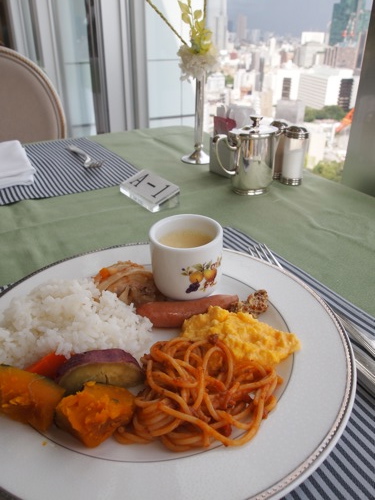 朝食は和洋2種のレストランで食べられるのだが、どちらも3000円と高い! が、軽く食べに行く場所が近所にないため、東京タワーを眺めるのを口実に、初日は最上階の展望レストランへ。