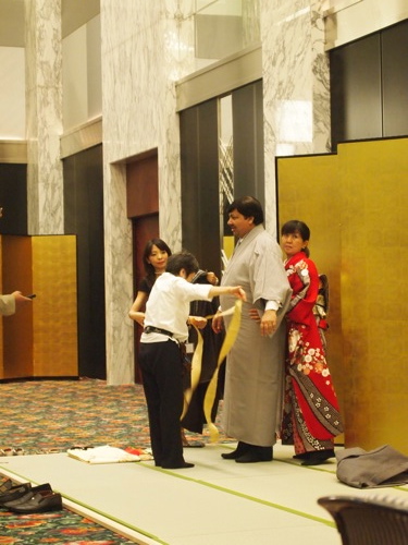 女性の参加者は少なめだったものの、着物の着付けコーナーは何人かのインド人女性がトライしていた。派手な振りそでが妙にお似合いのマダム。とてもかわいい。