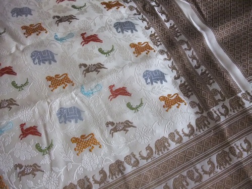 動物柄がユニークな、しかしまとえば上品な印象のサリーである。