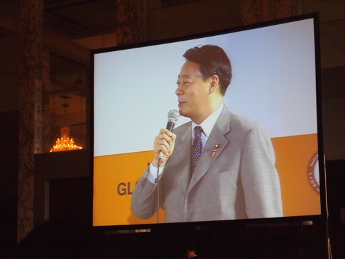 まずは、新総理の野田さんが登場。さすが現職だけあり、特設のガードされた通路から壇上にあがり、挨拶をし、写真撮影を終え、再び去って行った。ガードマンに囲まれ、隙がない。