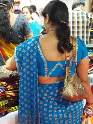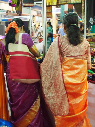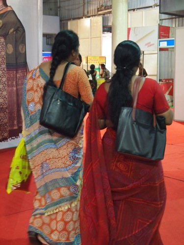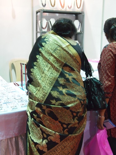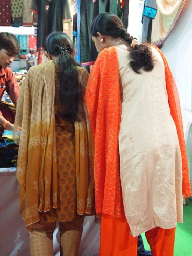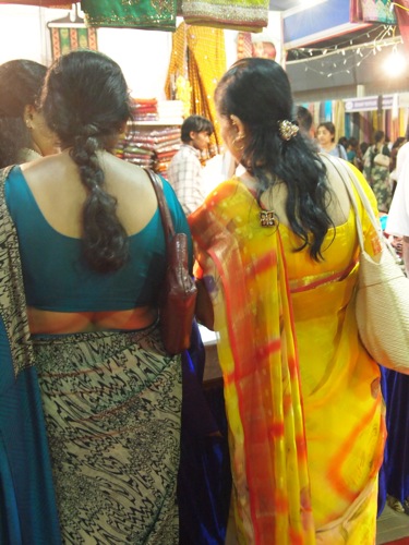 ムンバイとも、デリーとも異なる、女性たちの装い。もっともサリーフェアに来る人たちは、ファッションも封建的な人が少なくない。