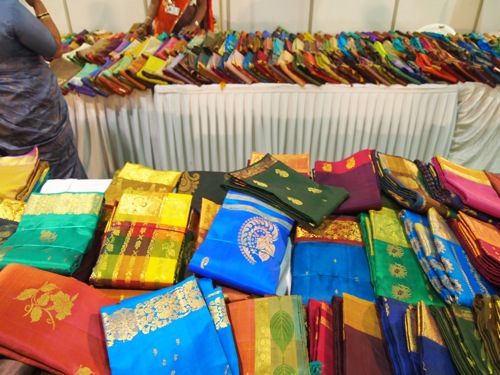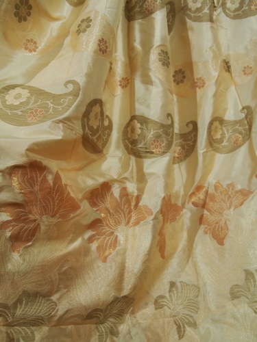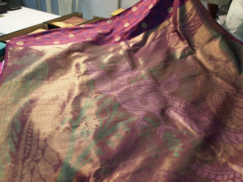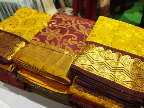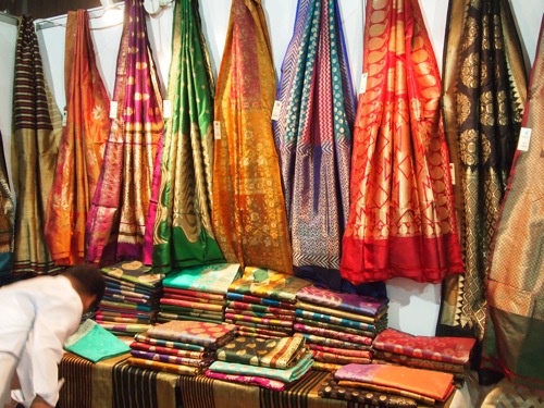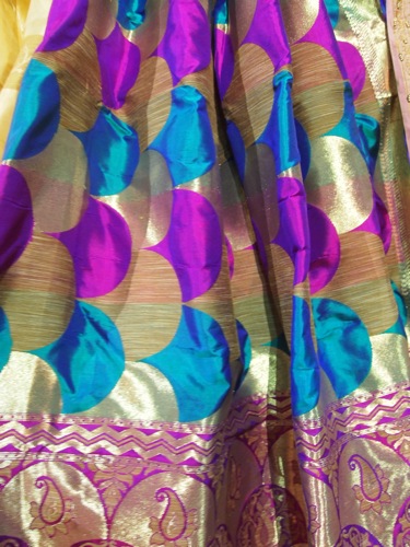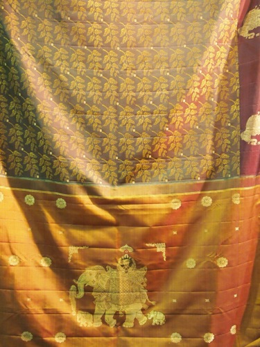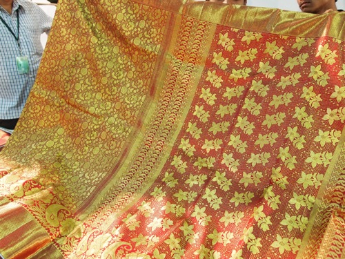 これは婚礼衣裳のサリー。金糸銀糸が折り込まれている。