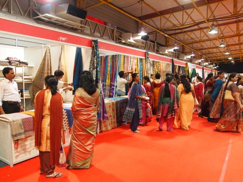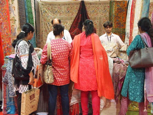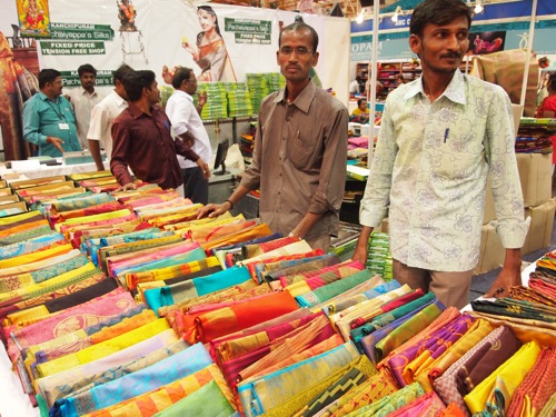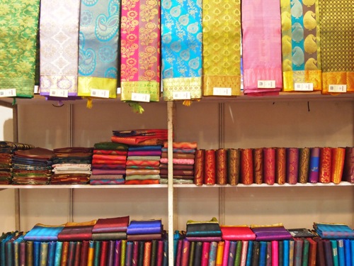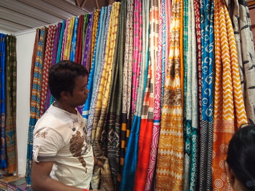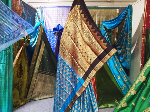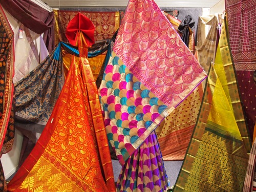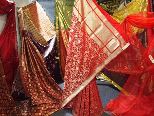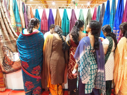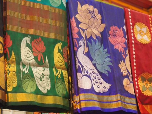 今年はなにやら「躍動的」なサリーのディスプレイも見られ、まばゆいことしきり。