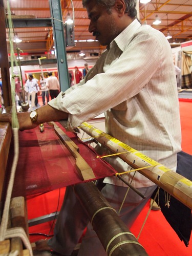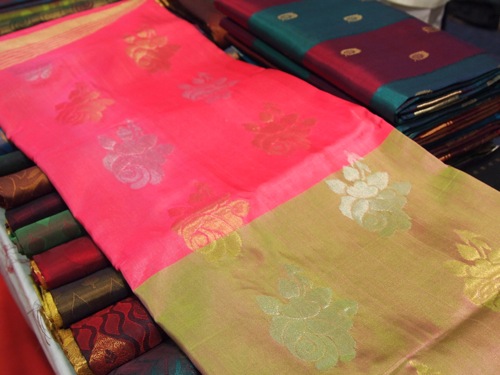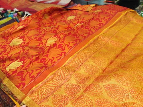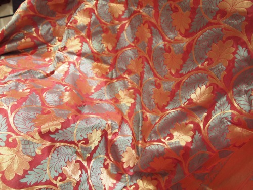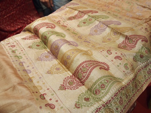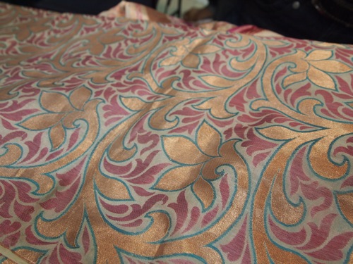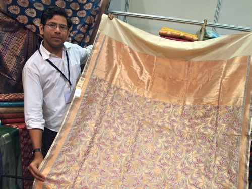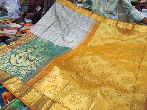 今回、わたしが一番気に入ったのは、このサリー。バナラシシルクの、大胆柄だ。とはいえ、全会場のサリーの中では、上品な部類に入る。
