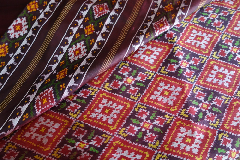 ふと、パトラ織りのサリーが目に留まった。パトラ織りとは、ダブル・イカット(経緯絣/たてよこかすり)が中心の、高度な技術を要する絣だ。グジャラート州のパタンがその故郷。