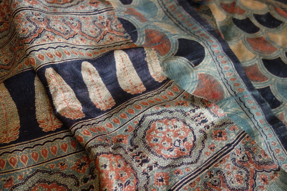 これは、天然の染料で着色された「草木染め」のハンドブロック・プリント。ロウ・シルクの質感がよく、