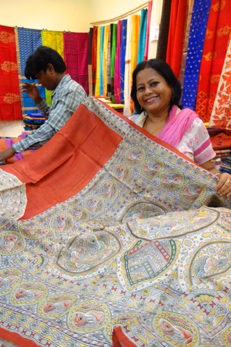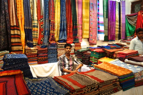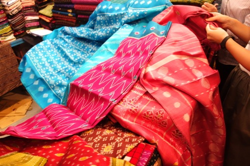 普段は滅多に行かないこの店。メインはクルタやモダンな衣類なのだが、店頭には、バンダニ(絞り)シルクやイカット(絣)、パトラ織り(これも絣)、カンタ刺繍など、インドの伝統的な手工芸が反映されたサリーが、数少ないものの、ディスプレイされている。