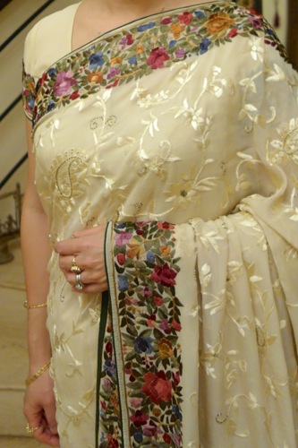 これは数年前、仕事でムンバイを訪れた時、クライアントをワールドトレードセンターにご案内した際、展示会で、まさに「発掘」した掘り出し物のサリーだ。パルシーの刺繍が施された、お気に入りの一枚。これも格安で入手できた幸運の一枚であった。