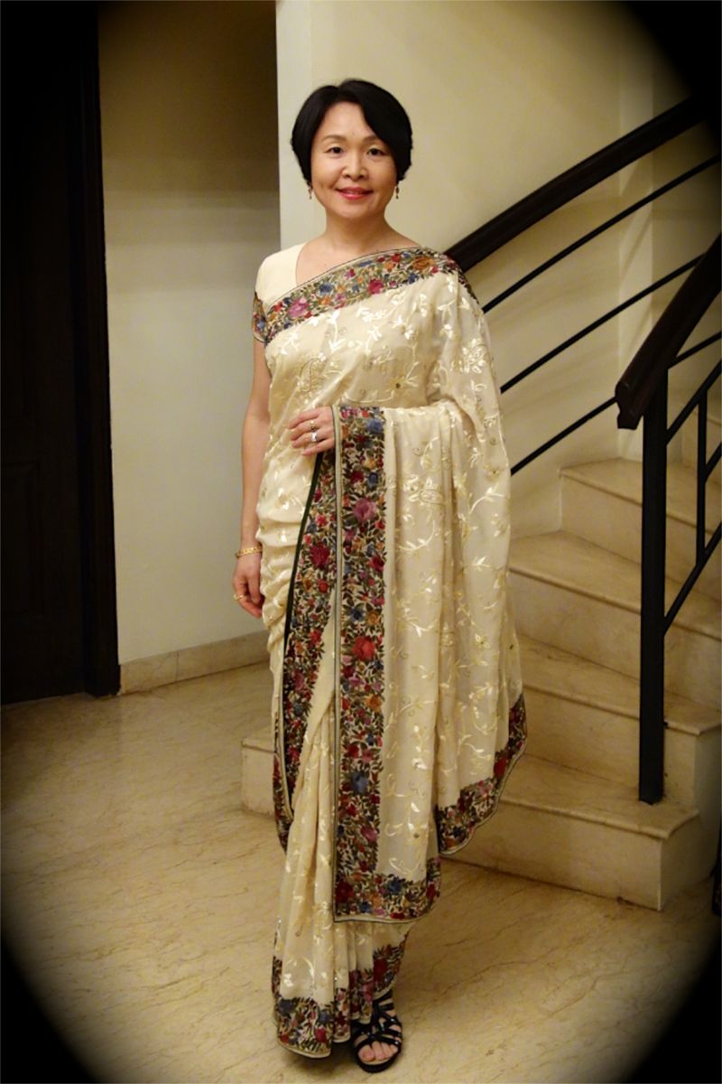 これは数年前、仕事でムンバイを訪れた時、クライアントをワールドトレードセンターにご案内した際、展示会で、まさに「発掘」した掘り出し物のサリーだ。パルシーの刺繍が施された、お気に入りの一枚。これも格安で入手できた幸運の一枚であった。