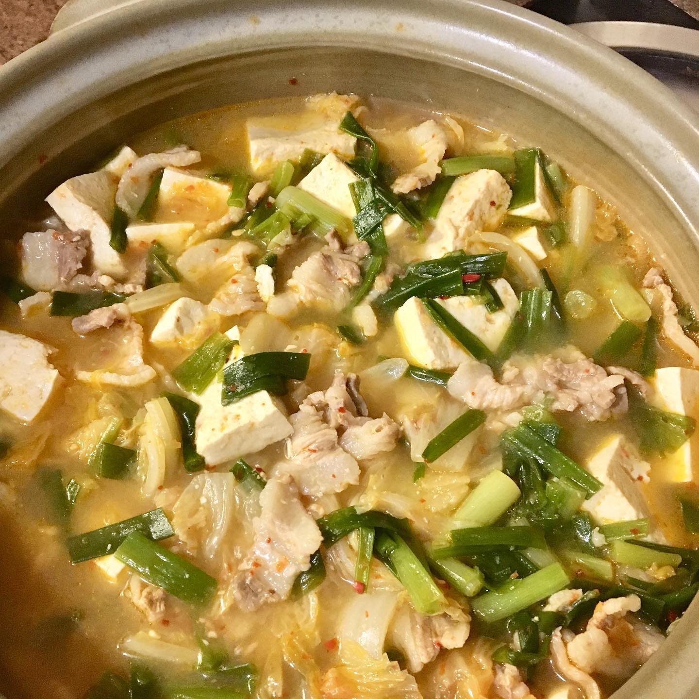 そして夕飯は、鍋。韓国料理店アリランの豆腐を入手した時には、毎度、鍋物となる。木綿も絹も、どちらもいいが、固めの木綿豆腐をグツグツ煮るとふわふわになり、適度な歯ごたえがあって、本当においしい。