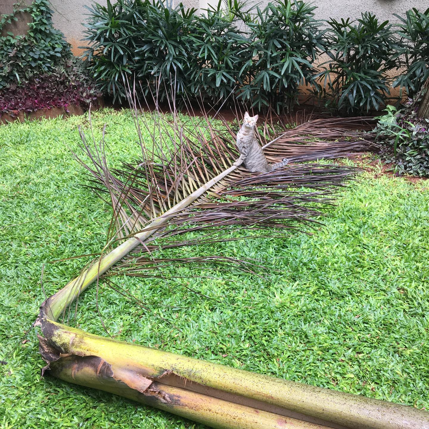 朝方、ドサッと落ちてきたヤシの葉で遊ぶ猫らと人間。日曜の今日は、のんびりと、読書や映画鑑賞をして過ごそう。ワインの残りでも飲みながら……🍷