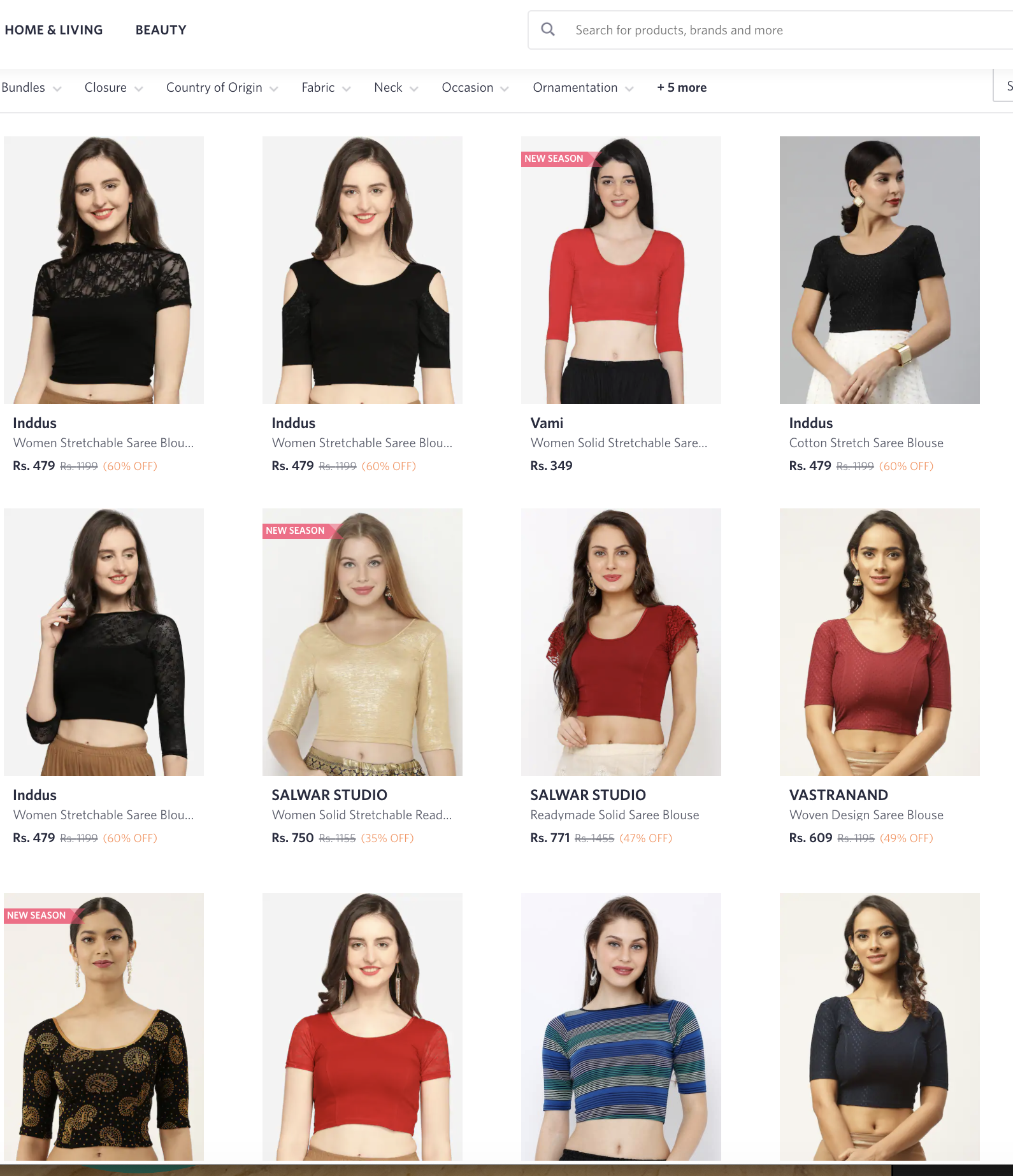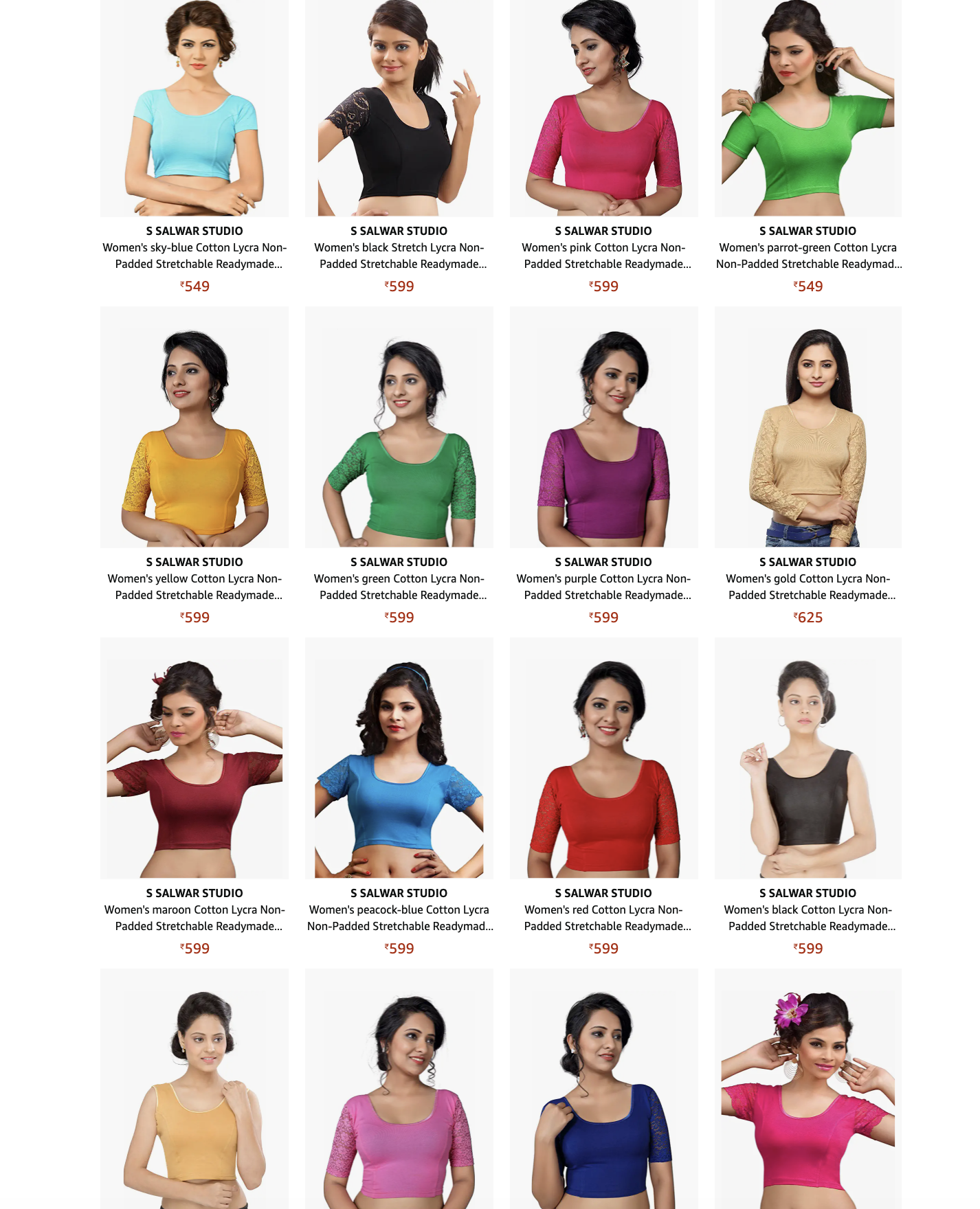 スコート(Skort)は、フランス発のスポーツブランド、デカトロンのインドのサイトで購入したが、ファッションサイト大手のMyntraやAmazon.inほか、さまざまなサイトで見つけられる。ただし、需要が少ないせいか商品数は少ない。サリー用の伸縮性があるサリーブラウスも、検索すればあれこれと出てくる。これはAmazon.inで購入した。色の選択肢も豊富。