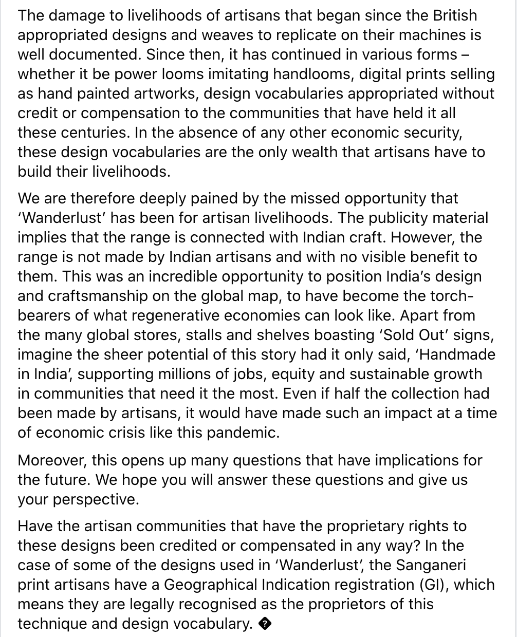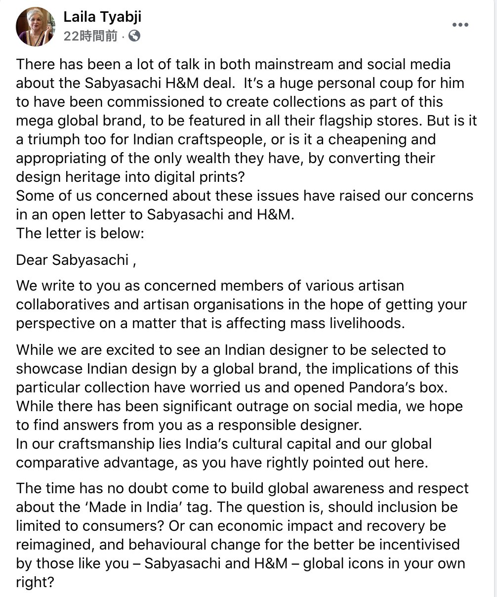 これまでしばしば紹介してきたインドの伝統工芸のバザールDASTKAR。その創始者であるLaila Tyabjiは、今回、ファストファッションのH&MとインドのデザイナーSabyasachiのコラボレーションについて、数日前からFacebookで意義を唱えていらした。やはり、DASTKARの創設に関わり、インドの伝統工芸及び職人たち(主には女性)を支援し続けている我が友人デヴィカは、この件に対して強く反発している。たやすく是非を判断し難い問題であり。経緯が記された公開されている文章の画像を貼っておく。