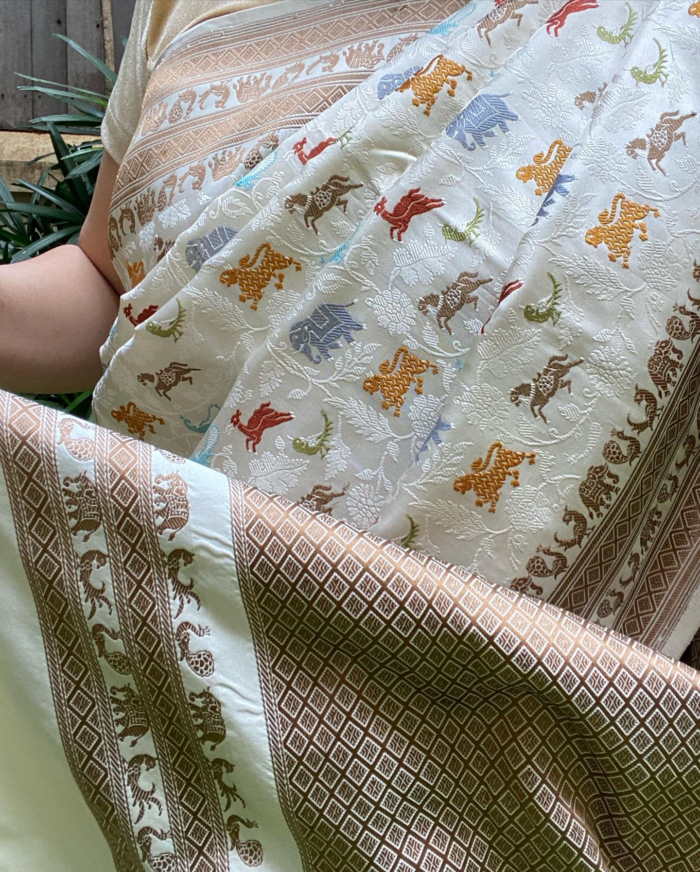 さて、わたしが本日着用しているのは、10年前にムンバイのサリー専門店で購入したバラナシ・シルクのサリーだ。