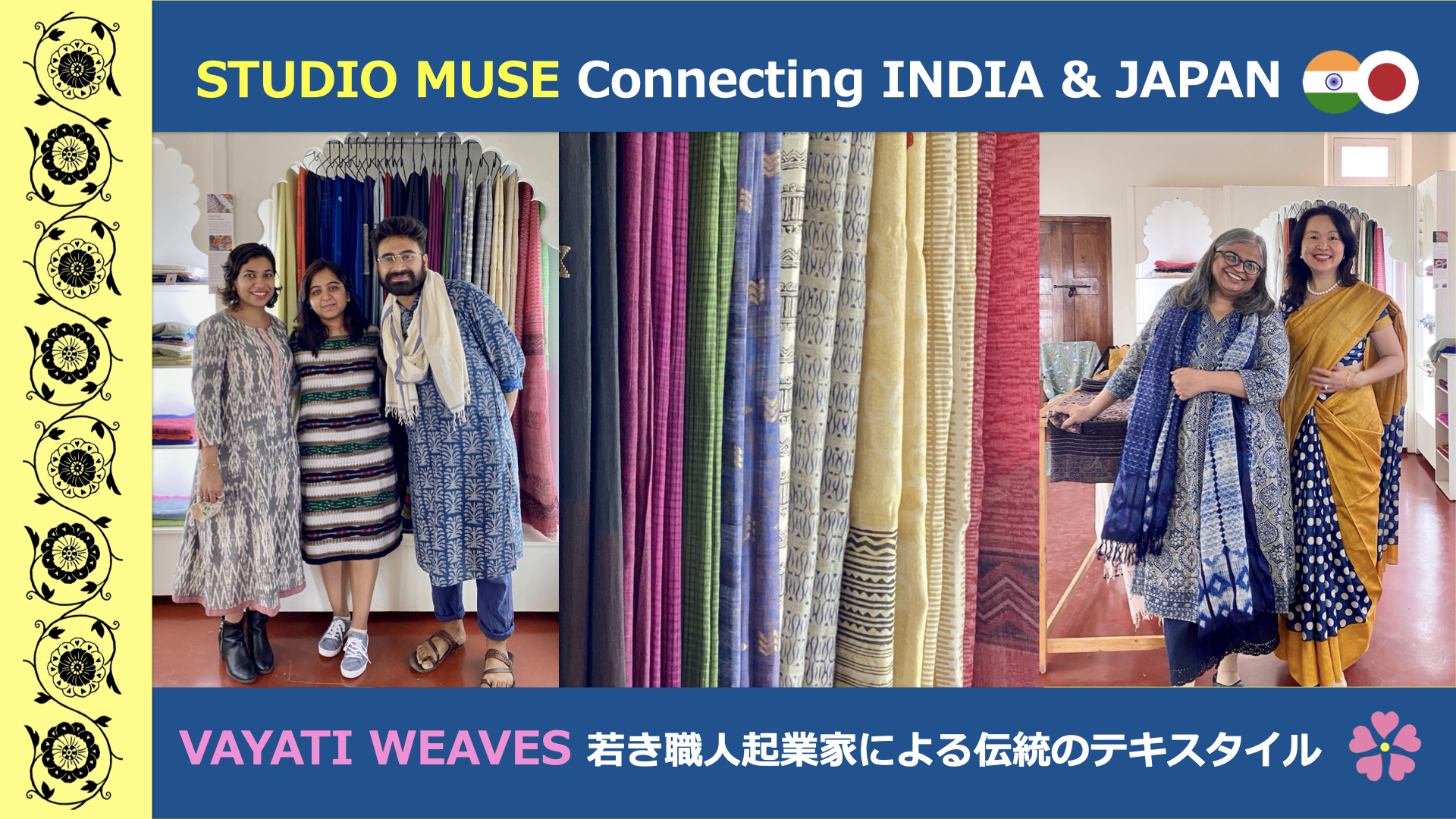 VAYATI WEAVESは、若きアントレプレナーのシシーラが、2019年に立ち上げた。デヴィカは、彼らのサポートにも尽力している。インド各地の伝統的なテキスタイル技術を継承する若者き職人。不易流行。基礎や伝統を守りながら、流行を取り入れた魅力的な布の数々。