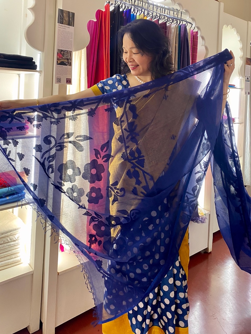 わたしはこの展示会に2度訪問。1回目には、天然染料によるオーガニックコットンのサリーを購入。それは、奇しくもシシーラ自らデザインしたものだった。