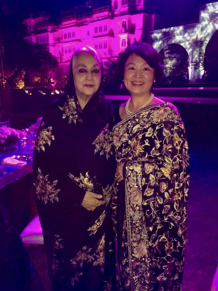 🥻「結婚=初のサリー着用」20周年を迎え、現在「インド衣文化ブログ」も再構築中。懐かしい写真が無尽蔵。4年前ジャイプール・パレスでの晩餐会にて、マハラニ・パドミニと同席でお食事をした際の写真。私はパールシー(ゾロアスター教徒)の伝統的な刺繍のサリーを着用。今後、少しずつ紐解き紹介したい。