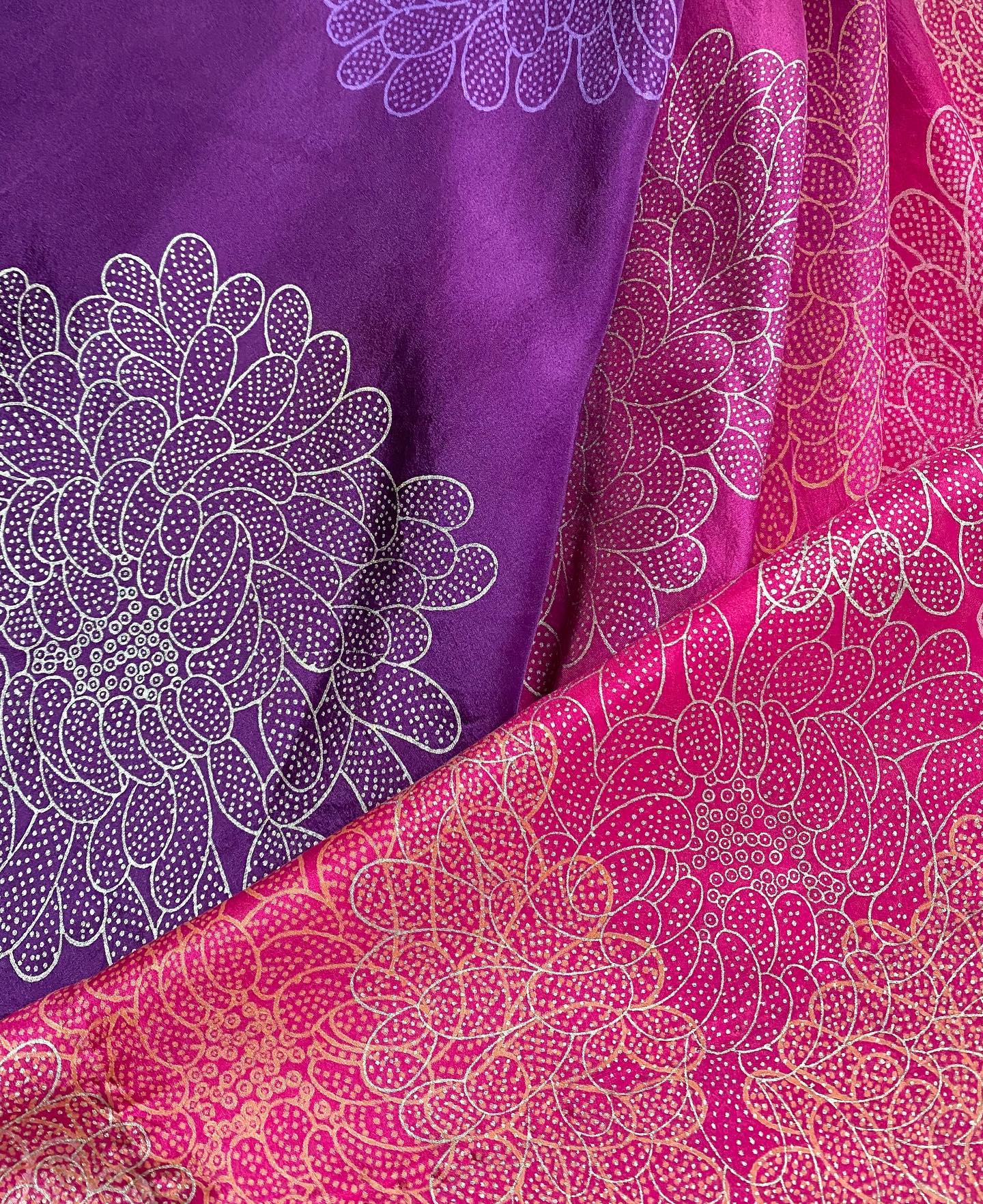さて、昨夜着用したのは、10年以上前、CINNAMONというブティックで購入したシルクのサリー。これは伝統的な手工芸というよりは、モダンなプリントだと思われる。ピンクから紫にかけてのグラデーション、菊の花のようなデザインが、日本の浴衣のようでもある。