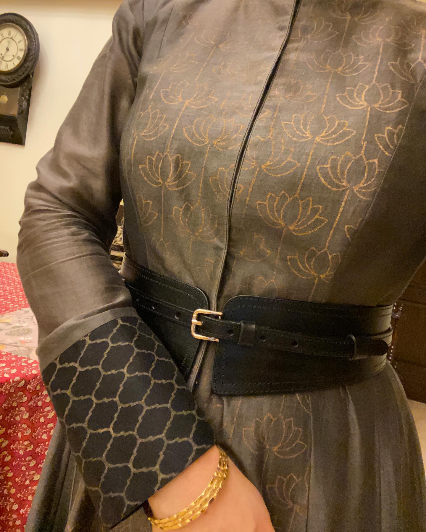 しっかりとした革製。長さもぎりぎり、わたしの厚みある胴に対応。ちなみにサリーにせよ、ロングドレスにせよ、「痩せ見え効果」が高いのがうれしいところ。もちろん、写真に映る時には「斜め30度」程度に立つことを意識している(←大事)。