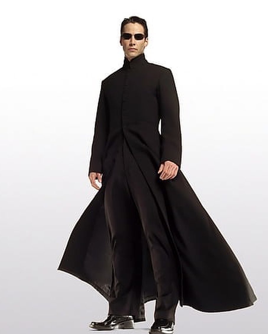 ちなみにこのドレス。身頃がフックで閉じられるのはウエストまで。その下はコートのように開いているので、薄手の黒いパジャマ(パンツ)が付いている。裾を翻して大股歩きをしようものなら、The Matrixのキアヌ・リーヴス状態だ。