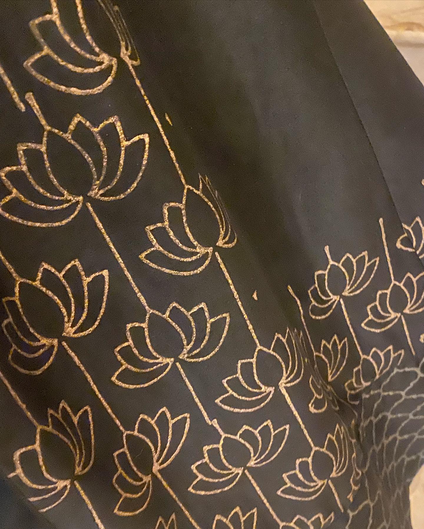 グレイから黒に至るグラデーションが上品なシルク素材に、金色の染料で蓮の花のハンドブロック・プリントが施されている。軽くて着心地がいい。踊りやすい。