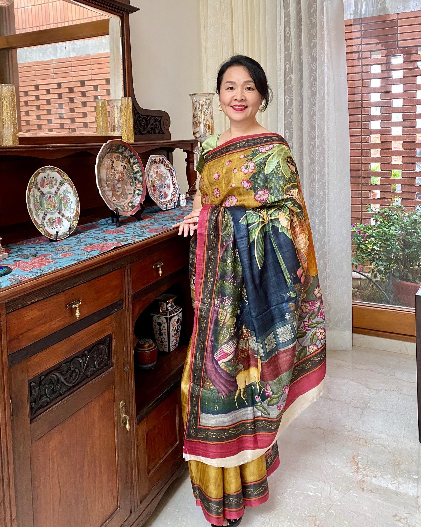 この日のドレスコードは「シルク」ゆえ、迷わずサリーを着用することに。実は先日のムンバイでKala Niketanを訪れた際、伝統的な絵画をプリントしたサリーが目に止まった。「プリント」という技法は、伝統的ではないものの、タッサーシルクの上に渋目の色合いで描かれた女神たちが美しく、しかも極めてリーズナブルとあって、即、購入したのだった。